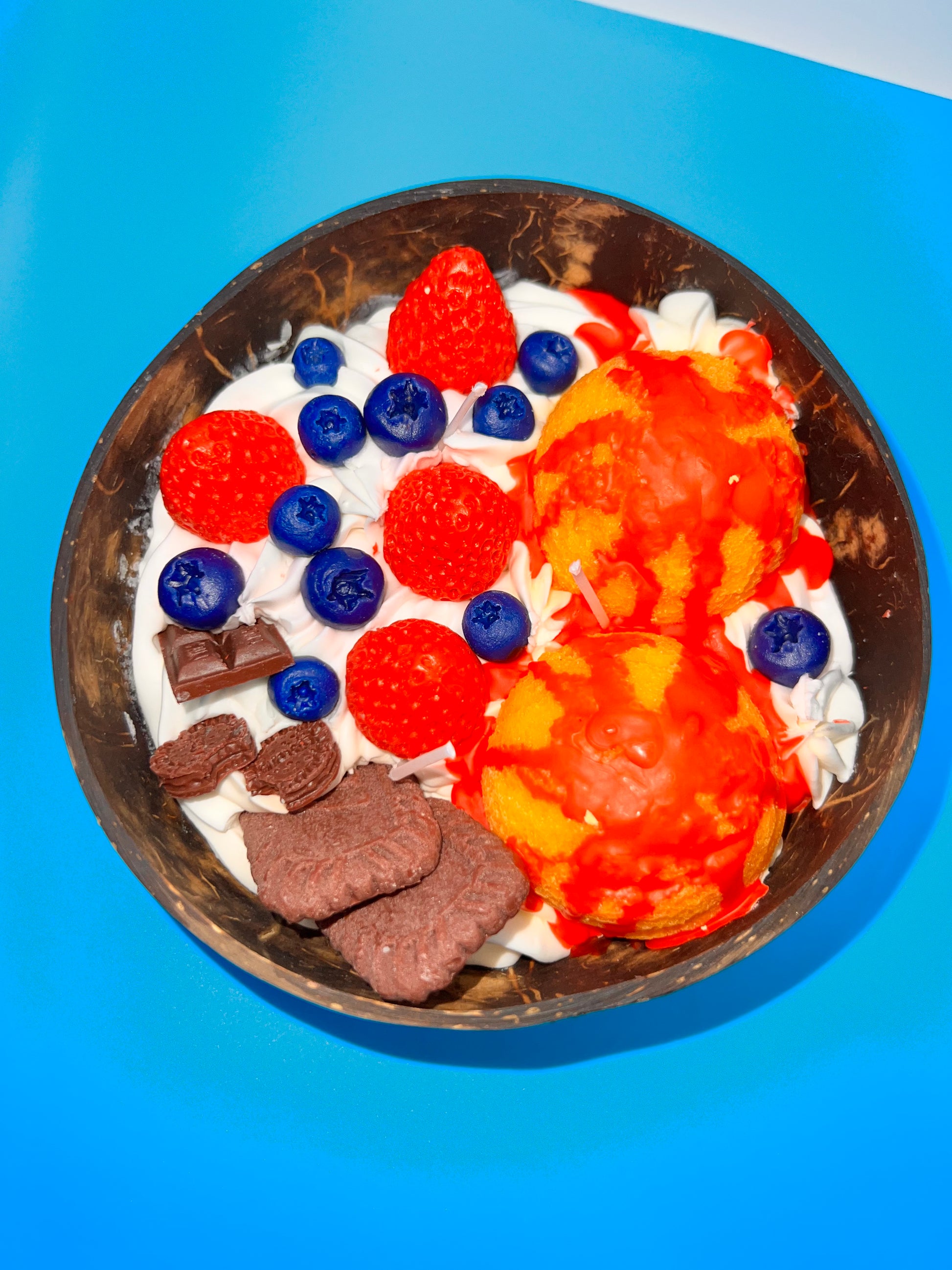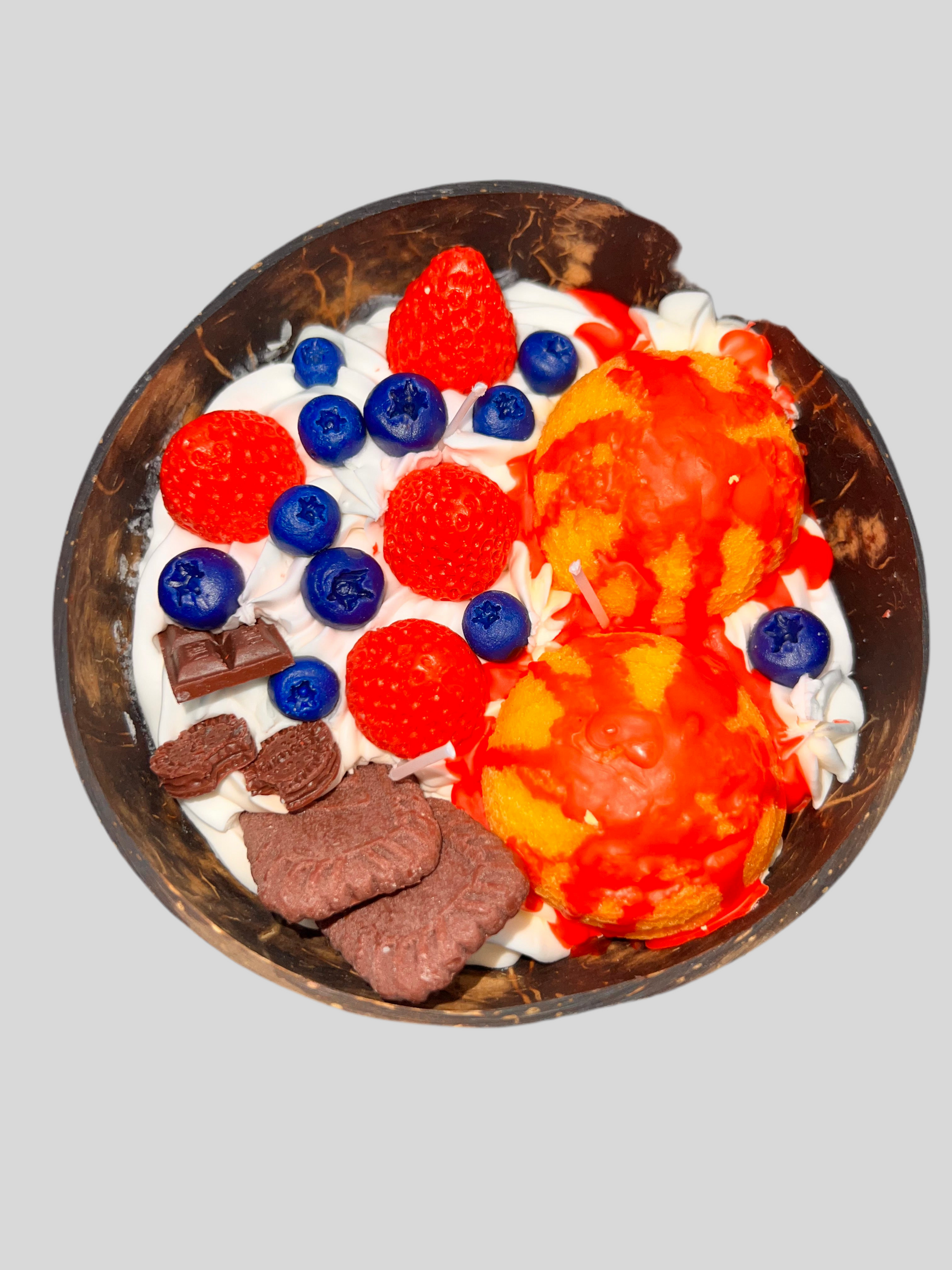 Meet your new obsession: our Berry Bliss Dessert Candle, hand-poured in a real eco-friendly coconut shell, bursting with sweet fruity fragrance and topped with realistic whipped wax, strawberries, blueberries, cookies, and chocolate bites!