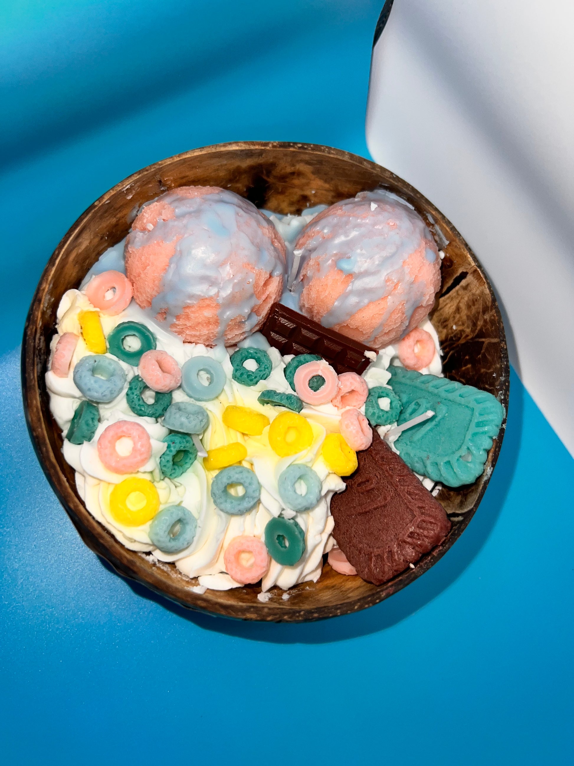 Infused with rich chocolate aroma, topped with realistic whipped wax, cereal rings, and candy details, all nestled in an eco-friendly real coconut shell.