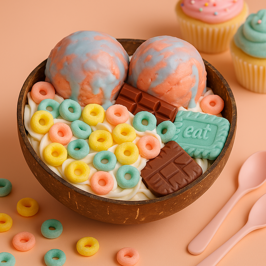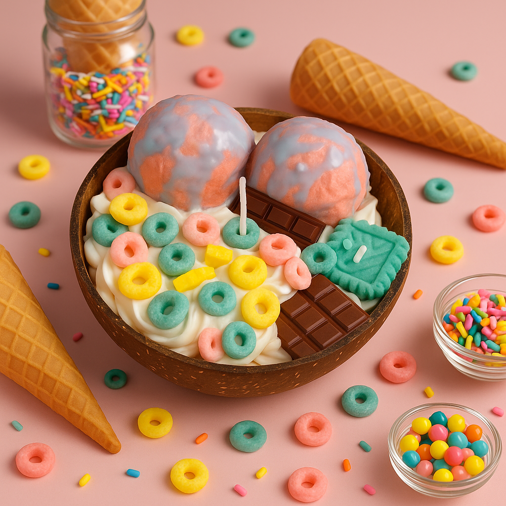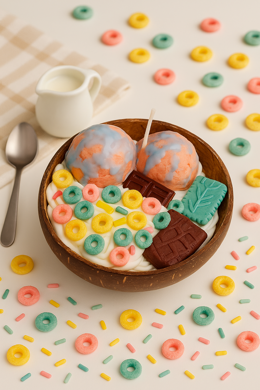 Infuséd with rich chocolate aroma, topped with realistic whipped wax, cereal rings, and candy details, all nestled in an eco-friendly real coconut shell.