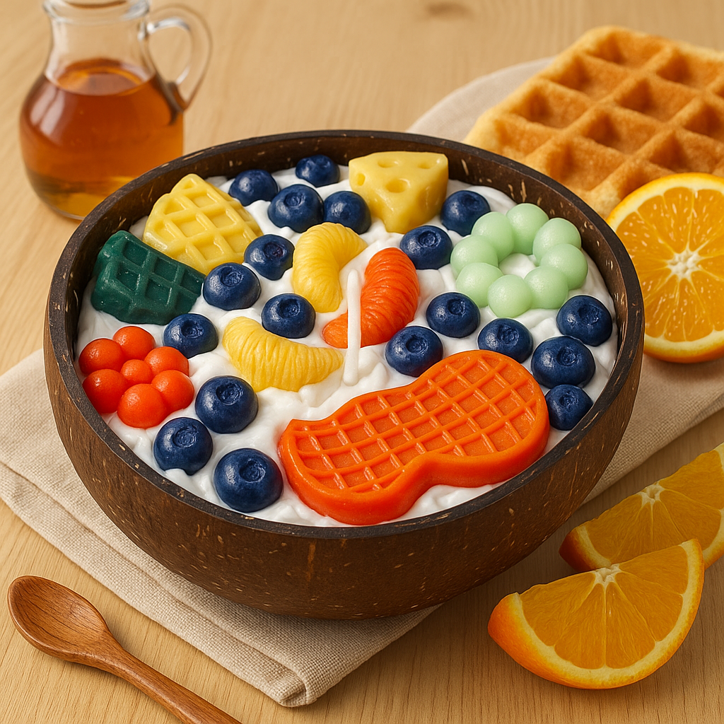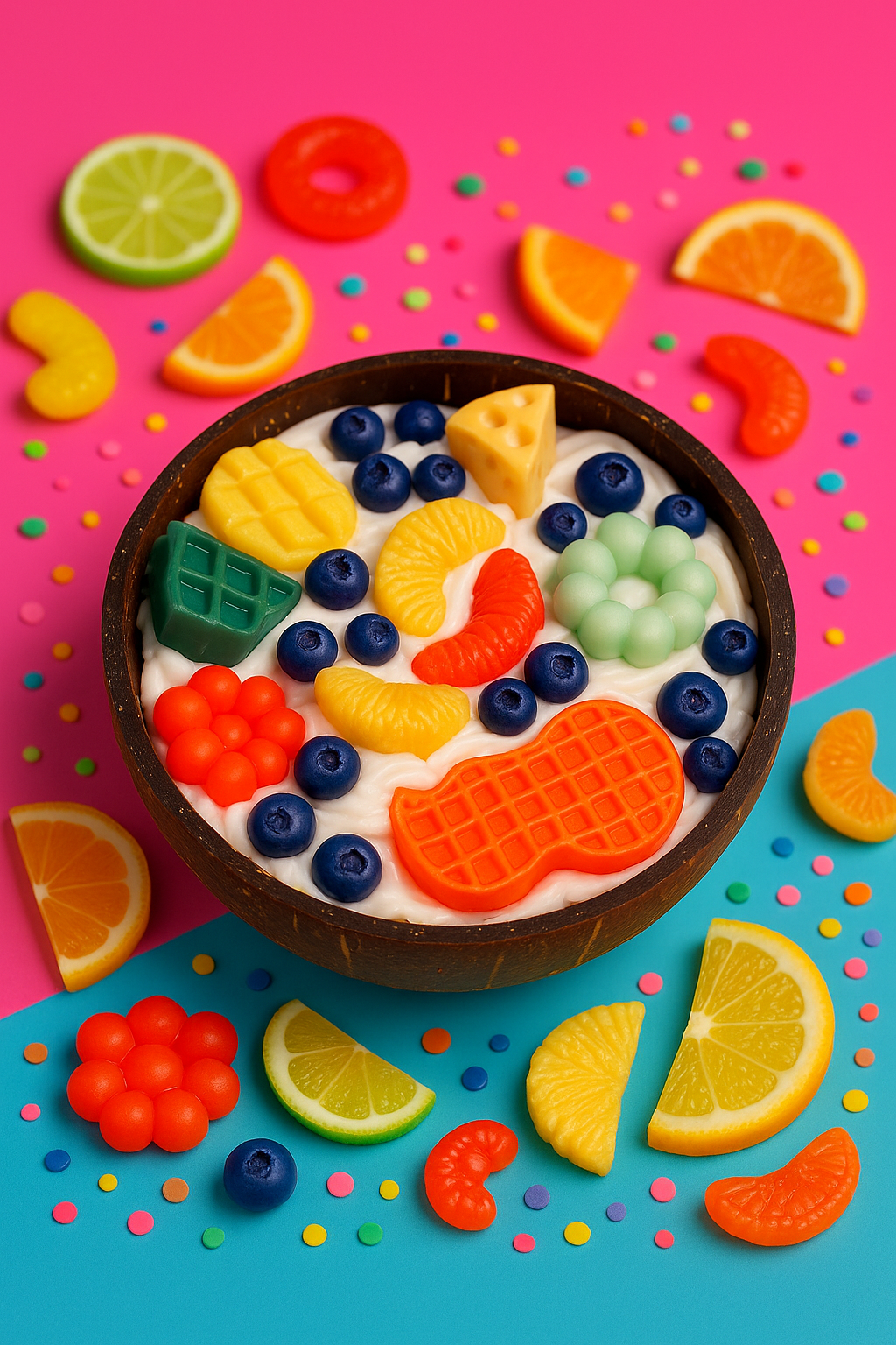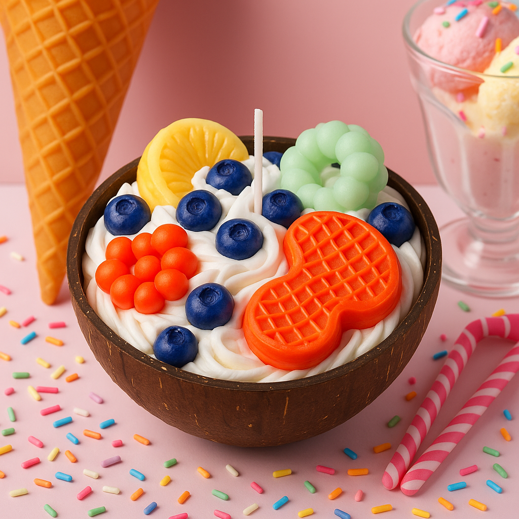 Hand-poured into an eco-friendly coconut shell, this vibrant scented candle isn’t just a treat for your nose — it’s a feast for your eyes! Featuring playful fruit-inspired wax designs like waffles, berries, and tropical slices, each candle is topped with rich whipped wax for a decadent, dessert-like finish.